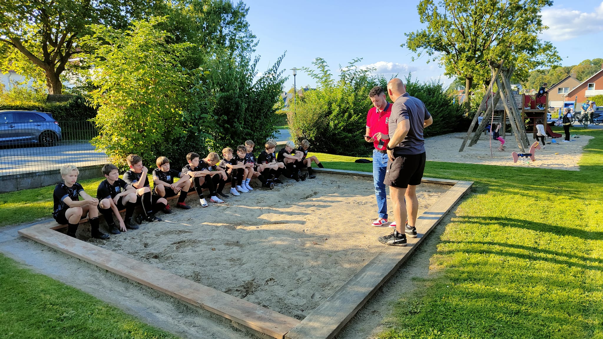 Am 3. Spieltag holten die Jungs heute die ersten drei Punkte in der Kreisliga! Nachdem es zu Beginn der Saison zwei deutliche Niederlagen ohne eigenes Tor gegeben hatte, so gab es in der heimischen Sonnenseearena endlich den ersten Saisonsieg mit einem klaren 8:1 gegen die JSG Dissen/Hilter. Somit ist die Truppe in der stark besetzten Liga angekommen. Vielleicht lag es ja an der Taktikbesprechung vor Spielbeginn von Simon und Hamster im Sandkasten auf dem benachbarten Spielplatz 🙂 Weiter so, Jungs!