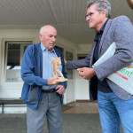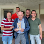 Zu guter Letzt standen die Ehrungen der Jubilare an: Neben Mirko Keine (25 Jahre Mitgliedschaft) wurden auch Hans-Jürgen Keisker (40 Jahre Mitgliedschaft) und Uwe Strehl (50 Jahre Mitgliedschaft) geehrt. Die anwesenden Mitglieder spendeten den Jubilaren gebührenden Applaus. Doch damit nicht genug – den erstgenannten stahl dabei Hugo „Schrotti“ Frankenberg ein wenig die Show. Er feierte im Kreise der FC Familie unglaubliche 70 (!) Jahre Vereinszugehörigkeit. Sein erstes Punktspiel für seinen FC bestritt er im Jahre 1958! Während Carsten Wallenhorst als langjähriger Wegbegleiter Schrottis ein paar Anekdoten vergangener Tage auspackte, kommentierte dieser mit gewohnt kultigen Sprüchen und Aussagen – zur Belustigung der kompletten Versammlung. Carsten berichtet: Schrotti ist Vorbild für jeden der es mit dem Fußballsport hält. Seine Tugenden und Werte haben schon viele der Anwesenden geprägt und miterlebt. Schrotti wurde durch den anwesenden Bürgermeiser Guido Halfter für seine unzähligen Verdienste für den Verein mit einem Geschenk der Gemeinde geehrt. Dabei gab Guido zu, dass man im ehemaligen Gemeindehaus auch immer ein wenig Angst hatte, von Schrottis Bagger dem Erdboden gleichgemacht zu werden. Die Menge jubelte Schrotti zu – sicherlich das Highlight der diesjährigen Versammlung.