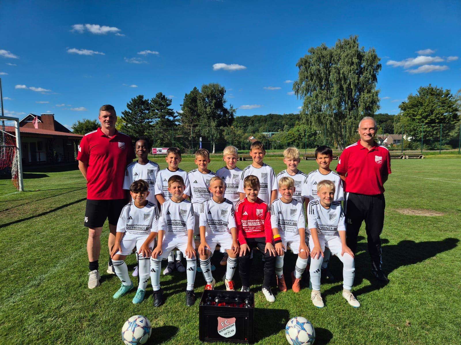 Die E1 des FC Bissendorf präsentiert sich vor der Bäckerei Schmidt in Bissendorf. Dank des großzügigen Sponsorings der Bäckerei freuen sich die Spieler und das Trainerteam der E1 des FC Bissendorf über neue Trainingsanzüge. An einem sonnigen Herbsttag trafen sich das Team sowie die Vertreter der Bäckerei nun vor der Filiale in Bissendorf, um gemeinsam Sponsorenfotos anzufertigen. Das gesamte Team möchte sich auf diesem Wege noch einmal herzlich für die Unterstützung bedanken und freut sich darauf, nun zu den Auswärtsspielen und Turnieren im schicken einheitlichen Dress zu erscheinen.