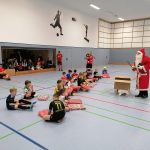 Vielleicht war aber auch der Besuch des Weihnachtsmanns beim letzten Hallentraining vor den Feiertagen der Garant für den positiven Turnierverlauf 🙂 Zur Überraschung der Kinder gab es nämlich nicht nur einen tollen Abschluss mit Eltern- und Trainermannschaften. Am Ende kam der Weihnachtsmann mit einem vollgepackten Schlitten in die kleine Halle. Mit dabei: ein kleiner Rückblick auf das Jahr, in welchem die Mannschaft große Fortschritte gemacht hat und mittlerweile im Ligamodus gut angekommen ist. Und natürlich durften Geschenke nicht fehlen. Jeder Spieler hat einen FCB-Rucksack erhalten, damit die Einheit gestärkt und ein einheitliches Auftreten zu den Spielen fortgesetzt wird. Auch der Verbundenheit zum Verein schadet es sicherlich nicht.