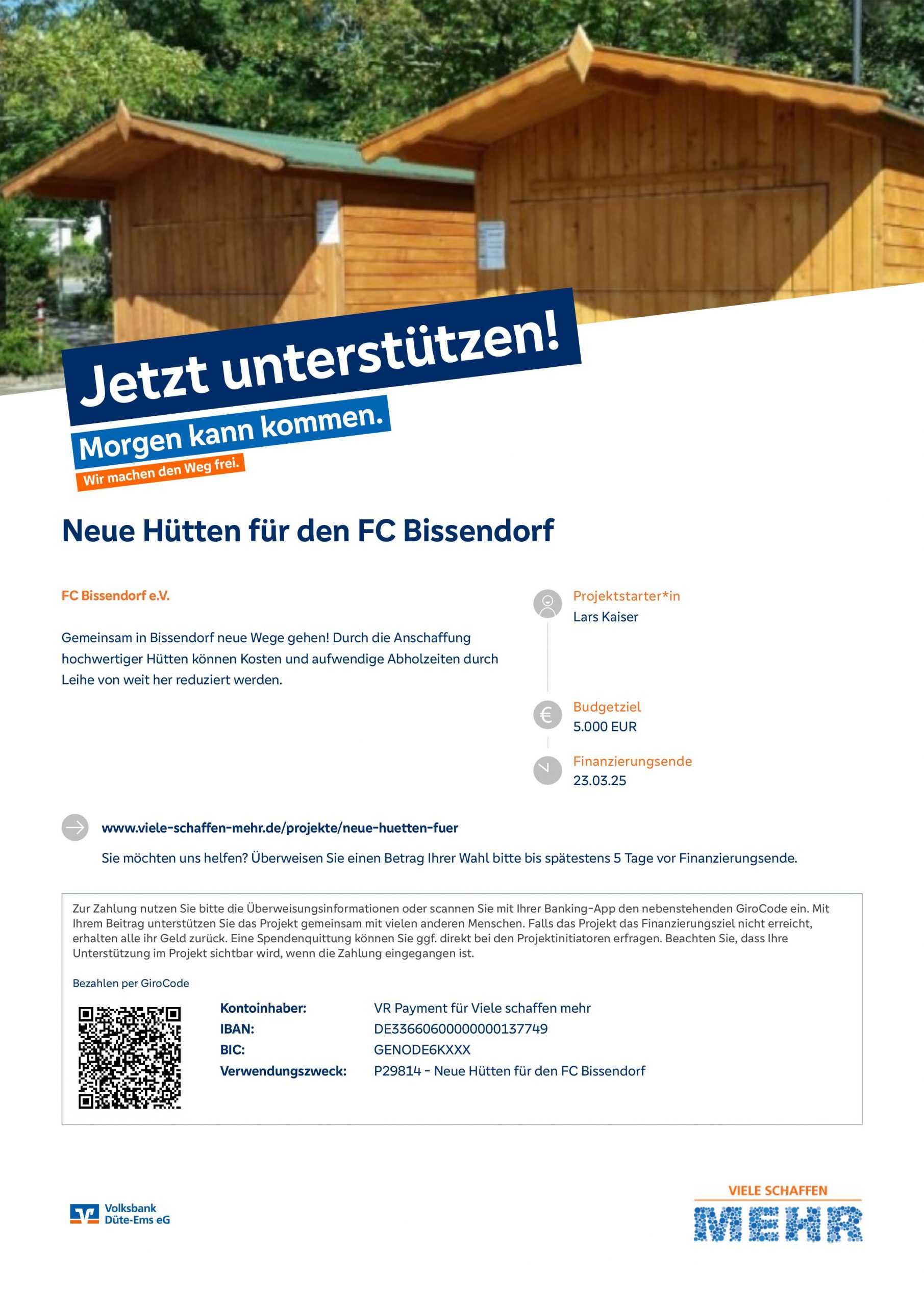 Seid dabei! Noch bis zum 23.März läuft der Crowdfunding Aufruf für die Anschaffung eigener Weihnachtsmarkthütten. Damit sollen teure Leih- und Transportkosten in den nächsten Jahren reduziert werden, um den so schönen FC Weihnachtsmarkt am FC Clubhaus zukunftssicherer zu machen. ALLE Besucherinnen und Besucher können also davon profitieren! Mit jeder einzelnen 5€ Spende gibt die Volksbank 10€ dazu. Aber nur, wenn der Betrag von 5.000€ erreicht wird! Alle weiteren Infos findet ihr in dem angehängten Link. Oder ihr klickt einfach auf den angehängten QR Code. Auf geht’s!