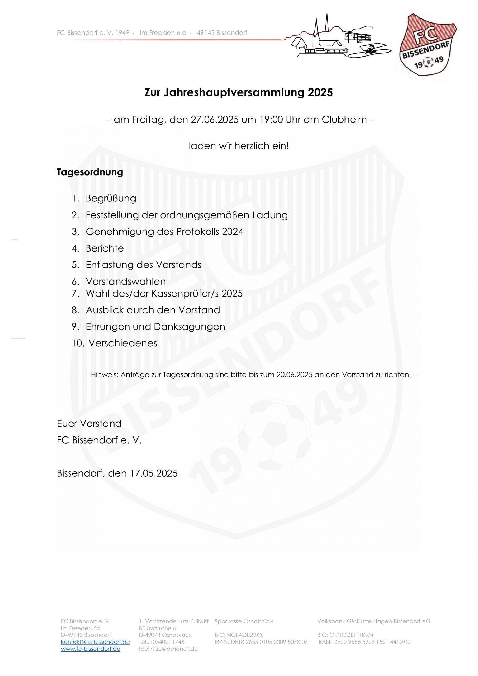 Und schon wieder ist ein Jahr vergangen und die nächste Jahreshauptversammlung inklusive Neuwahlen steht vor der Tür. Hiermit laden wir alle Mitglieder und Freunde des Vereins am 27.6. zum Clubhaus ein. Start ist um 19 Uhr. Die Tagesordnung findet ihr unten im Anhang. Wenn das Wetter mitspielt, wollen wir den Abend draußen verbringen und im Anschluss wie gewohnt noch nett beisammen sitzen. Bis dahin!