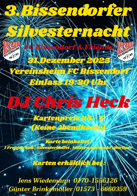 Termin Details Datum: 31. Dezember 2025 19:00 – 1. Januar 2026 6:00 Ort: FC Bissendorf 1949 e.V. Aller guten Dinge sind drei! Auch in diesem Jahr findet wieder eine Silvesterparty im FC Clubhaus statt. Genaue Infos zum Kartenverkauf folgen in der 2. Jahreshälfte. Ähnliche Beiträge