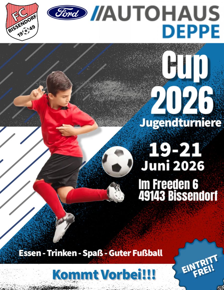 Termin Details Datum: 19 – 21. Juni 2026 Ort: FC Bissendorf 1949 e.V. Zum ersten Mal findet im Juni 2026 zum Saisonende ein großes Jugendturnier beim FC Bissendorf statt. Der DEPPE CUP! Wir freuen uns schon jetzt auf dieses große Event! Ähnliche Beiträge