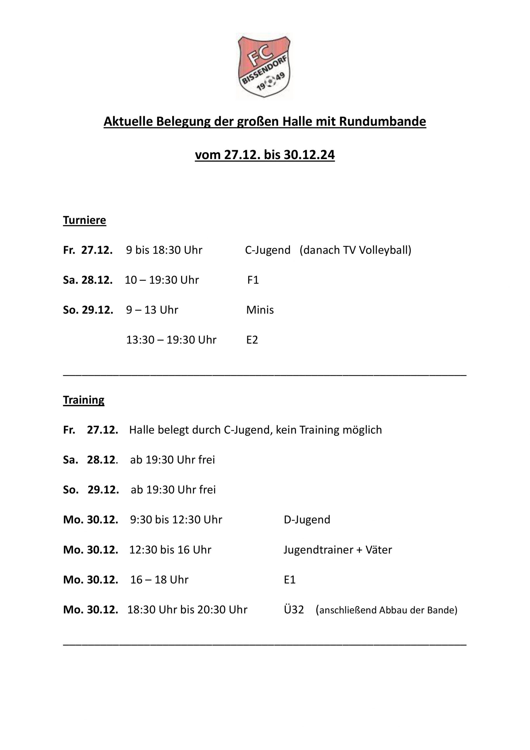 Um die Atmosphäre in der Halle etwas lebendiger zu machen, wird zudem ein DJ versuchen, die Stimmung bei diesem Event etwas aufzulockern. Darüber hinaus wird es eine Tombola geben, die von der Firma Thomas Philipps unterstützt werden wird. Die Kinder und Jugendlichen hoffen auf viele Zuschauer in der letzten Dezemberwoche! Einige Jugend- und Herrenteams freuen sich außerhalb der Turnierzeiten aber einfach auf tolle Trainingseinheiten mit der eigens hergestellten Rundumbande. Viel Spaß dabei! In der Übersicht unten findet ihr alle Turnier- und Trainingszeiten auf einen Blick.