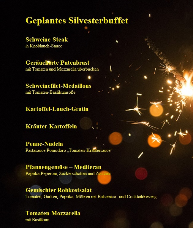 Habt ihr schon Pläne zum Jahresausklang? Falls nicht, dann kommt ins FC Clubhaus. Dort findet in diesem Jahr eine große Silvestersause mit dem bekannten DJ Kalla Rakete, Silvesterbuffet (Karte siehe unten) und reichlich Kaltgetränken statt. Für gute Stimmung wird sicher gesorgt sein. Alle weiteren Infos findet ihr im angehängten Flyer. Das Orga Team um Jens, Stefan und Günni freut sich auf weitere Kartenbestellungen. Die Hälfte der Tickets ist bereits vergriffen. Also, seid auch ihr dabei!
