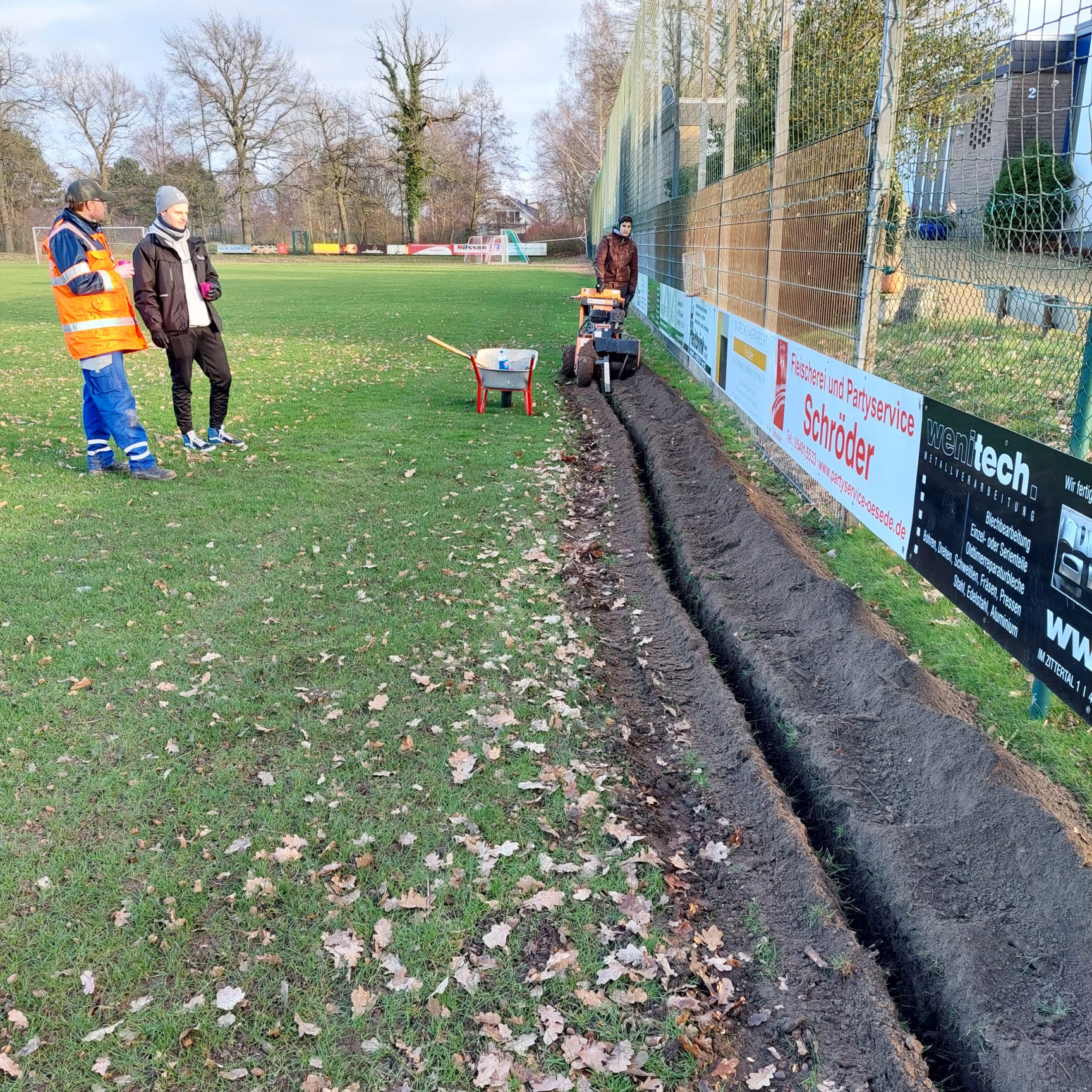 Ein zentrales Projekt ist hierbei die Inbetriebnahme eines Mähroboters. Nachdem im vorherigen Jahr Nölli und Strato dafür bereits eine zusätzliche Stelle oberhalb des Spielfeldes gepflastert hatten, um weiteren Platz zum Abstellen der Tore zu schaffen, so wurde in der letzten Woche durch Lars Kaiser und seine Helfer die nächste Phase eingeläutet (siehe Foto unten). Durch die Verlegung der notwendigen Kabel für die Ladestation kommen wir der Installation durch die Firma Janzen Rasenmäher einen kleinen Schritt näher. Weitere Schritte werden jedoch folgen müssen, um den Mähroboter schließlich in Action zu sehen. Die Gemeinde Bissendorf hat uns als Verein bei diesem Pilotprojekt sehr offen und entschlossen unterstützt! Vielen, vielen Dank dafür! Wir hoffen dadurch, die Qualität des Rasenplatzes für unsere Mitglieder langfristig verbessern zu können. Außerdem fiele das regelmäßige und zeitaufwendige Mähen durch einen Trecker weg.