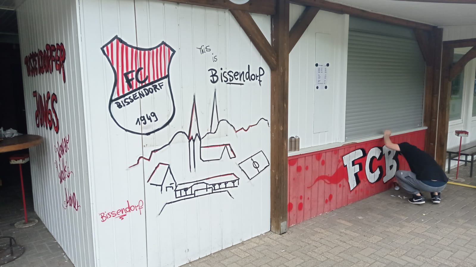 Zum Start der Sommerferien sind wieder ein paar Kleinigkeiten auf unserer schönen Sportanlage am Sonnensee hinzugekommen. So begrüßt zum einen eine neue Vereinsfahne die Gäste am Eingang. Außerdem hat „unser“ Graffitikünstler Chris weitere Symbole und Bilder am Clubhaus fertig gestellt. Wie schon in der Sitzecke nebenan passen die neuen Bilder perfekt zum FC Clubhaus. Vielen Dank dafür!